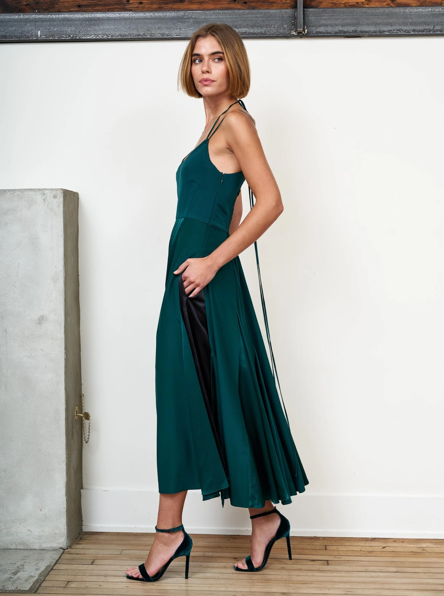 This dreamy, emerald silk dress features matte and shine panels with a navy lining that peeks out of side seam slits. And let’s not forget the smocked back and adjustable straps to ensure that this dress fits you like a glove.