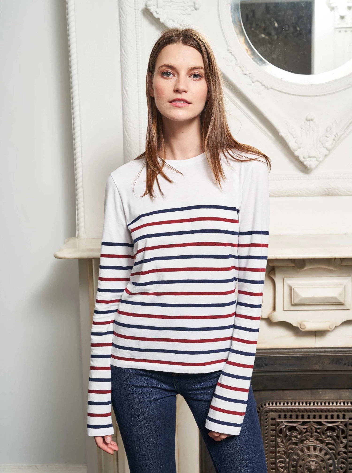 Our classic long-sleeve tee – a wink at iconic French style – with yarn-dyed navy and burgundy stripes in lightweight cotton.