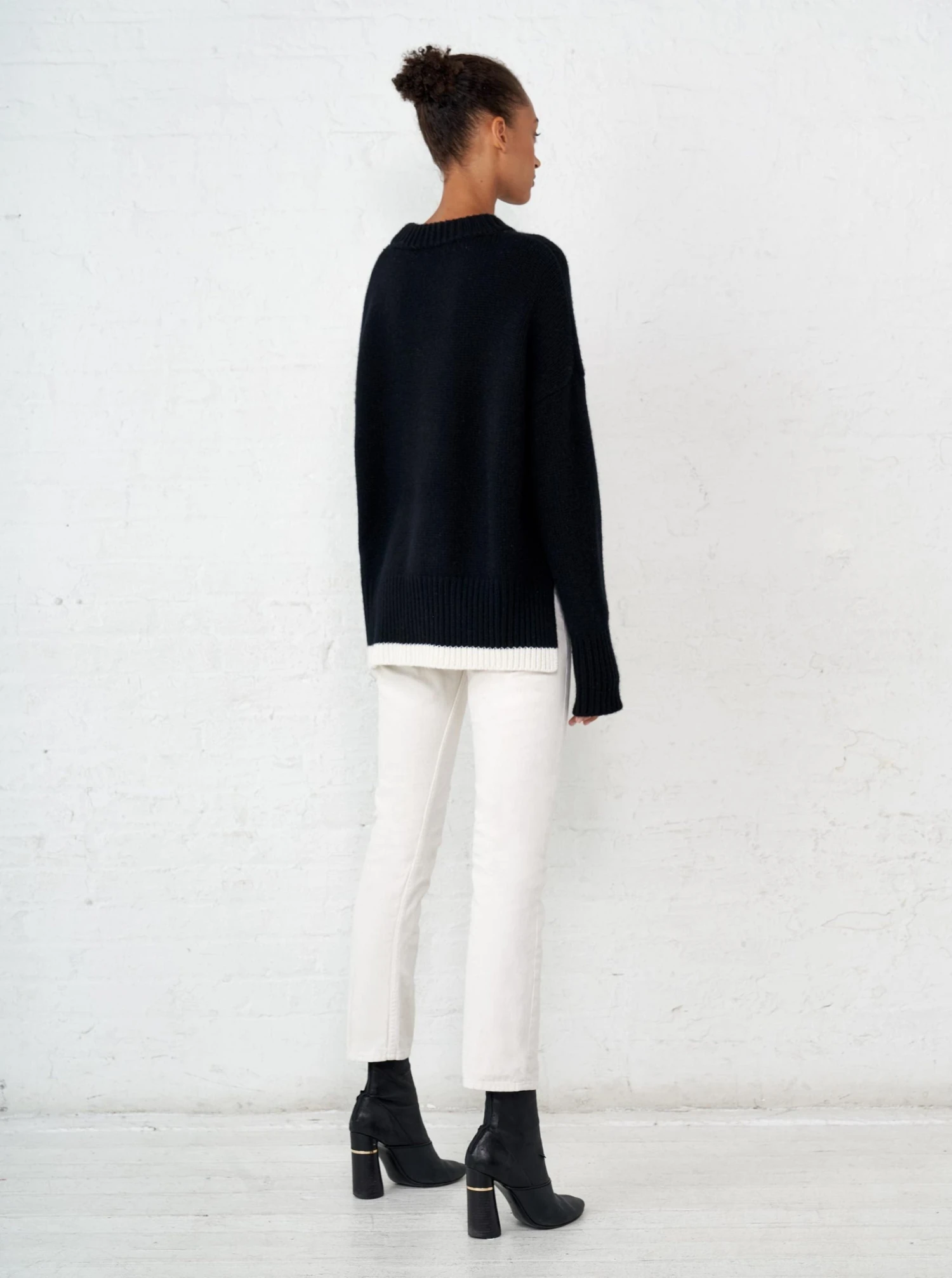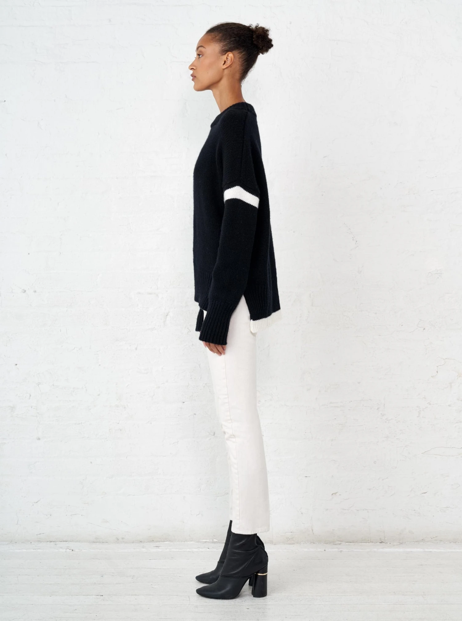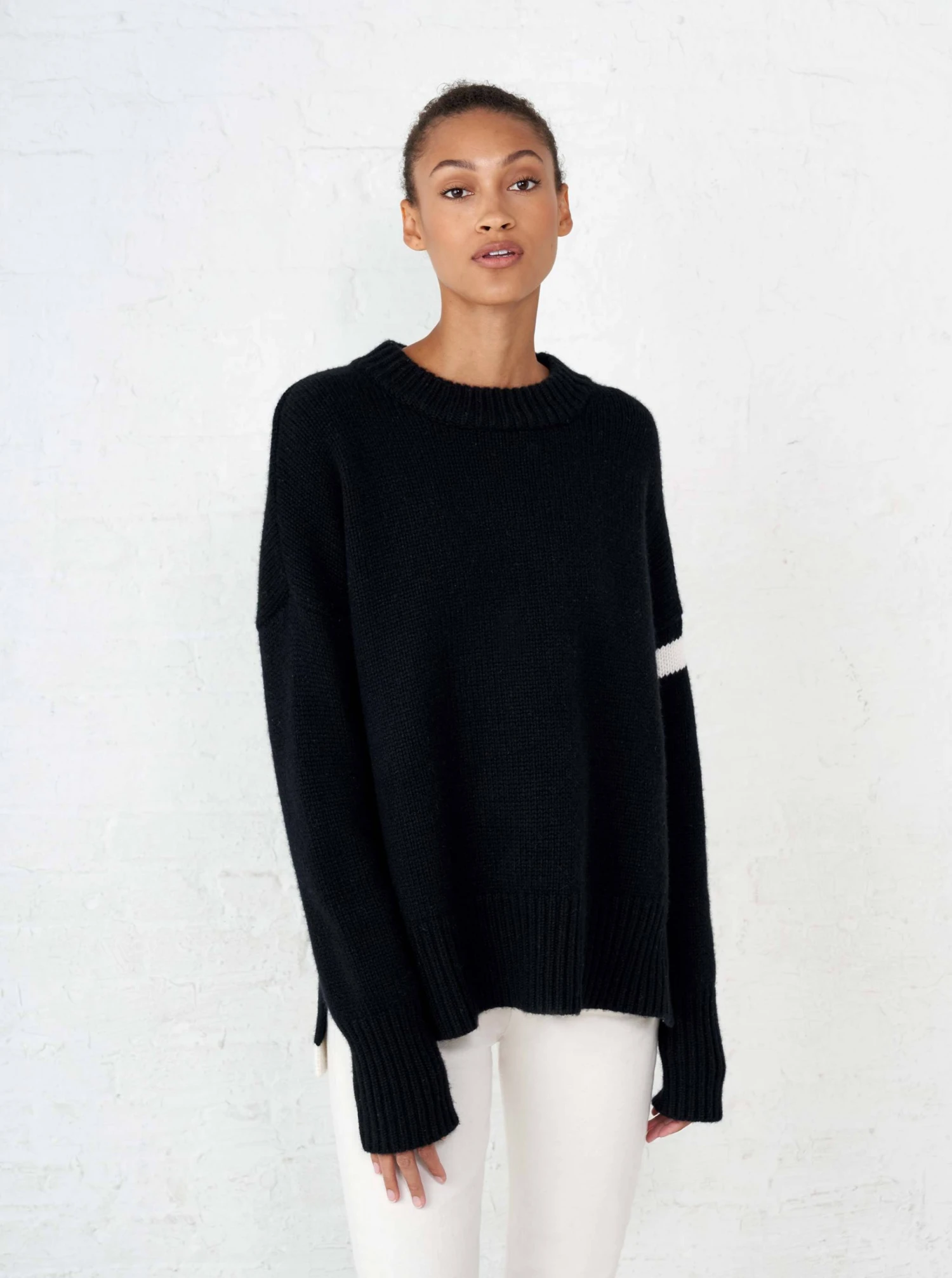 Trust us, you will be living in (and living for) this 7-ply black cashmere sweater with contrast cream stripe detailing this fall.
