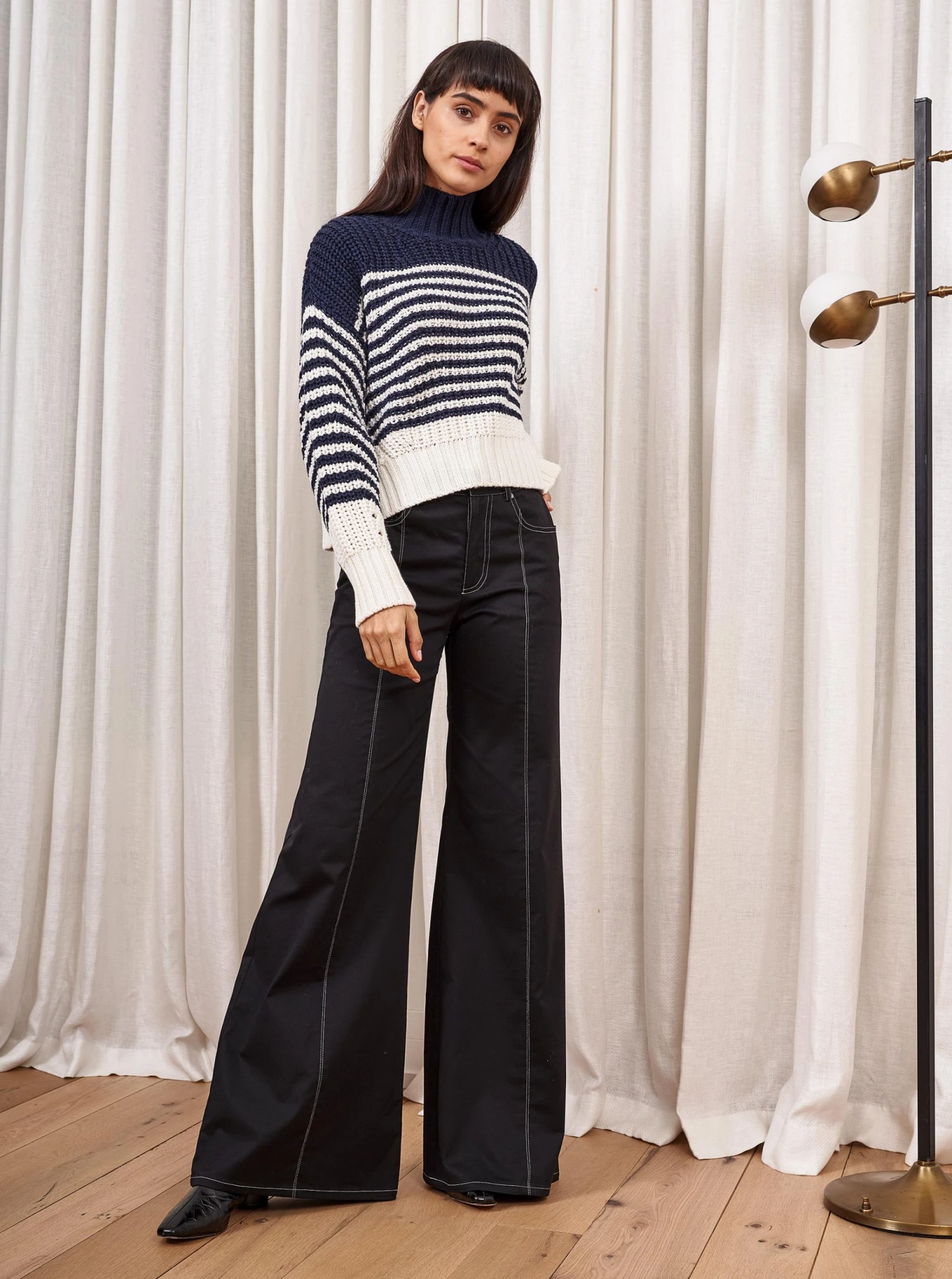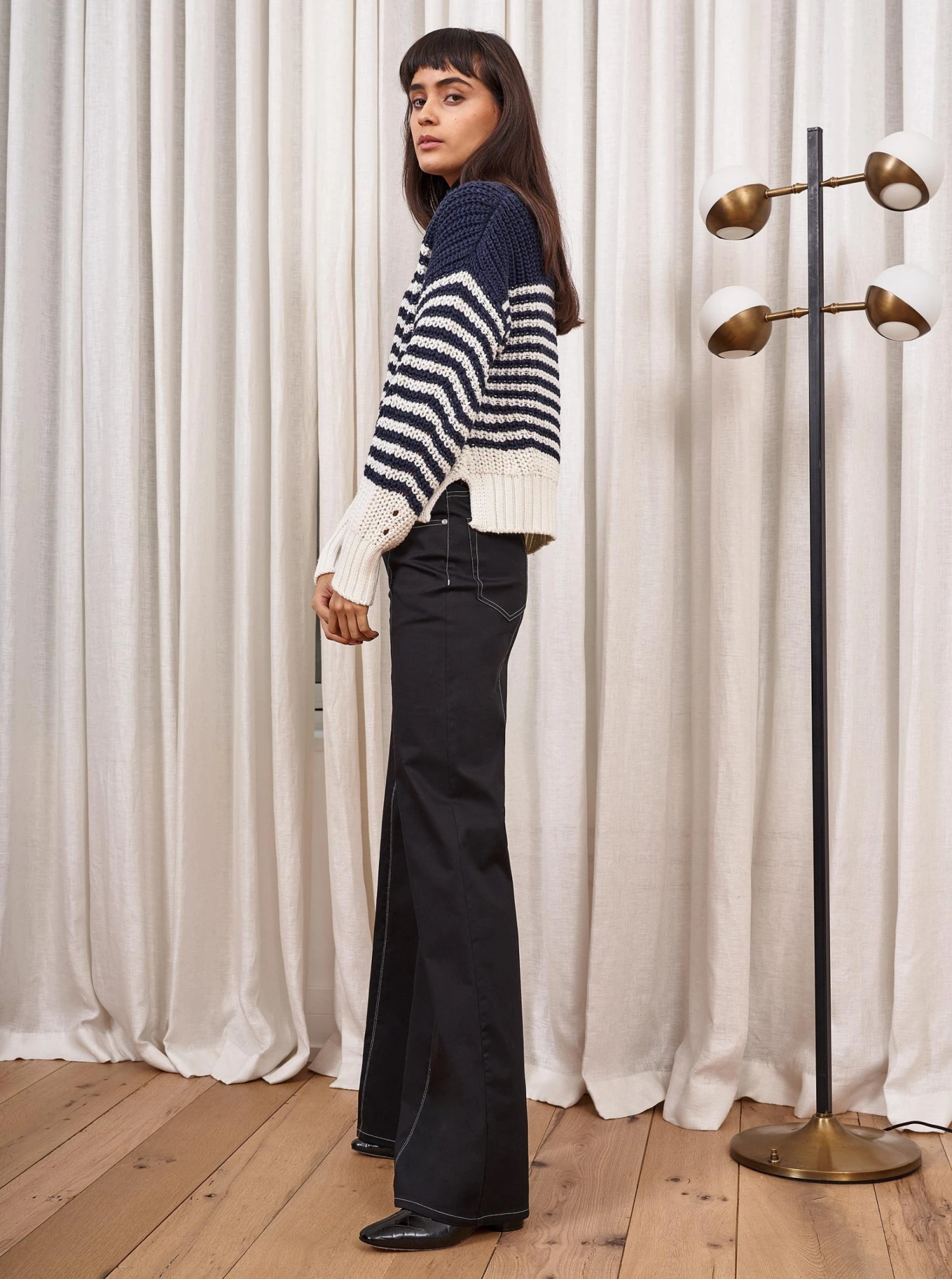 Being warm has never looked so good in our Bretagne Sweater in speckled navy and cream stripes. Fabulously soft in 100% merino, it features a wide sleeve and fitted cuff with directional ribbing and pointelle details that elevate it above your average knit.