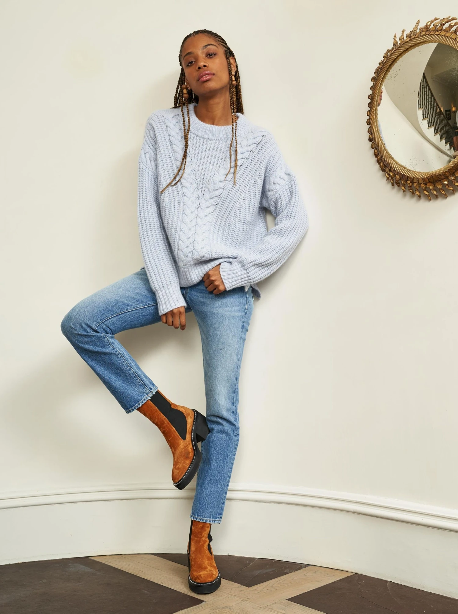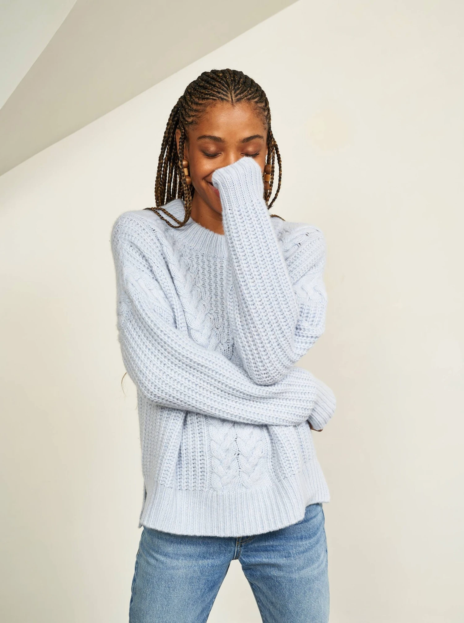 This feathery-soft, cable rib sweater in light tan cashmere is ready for the cold, goes with anything and most importantly, keeps it chic.