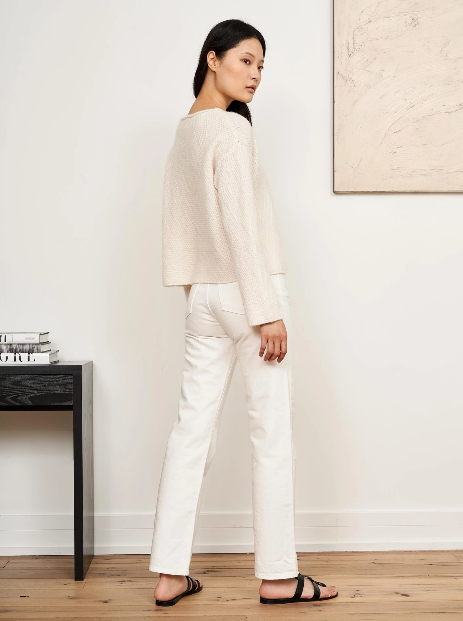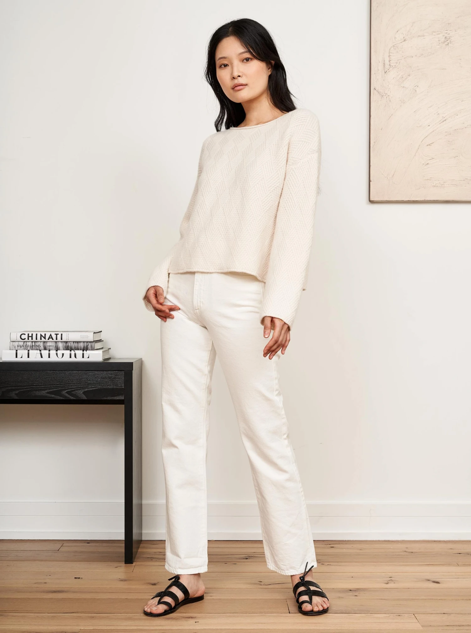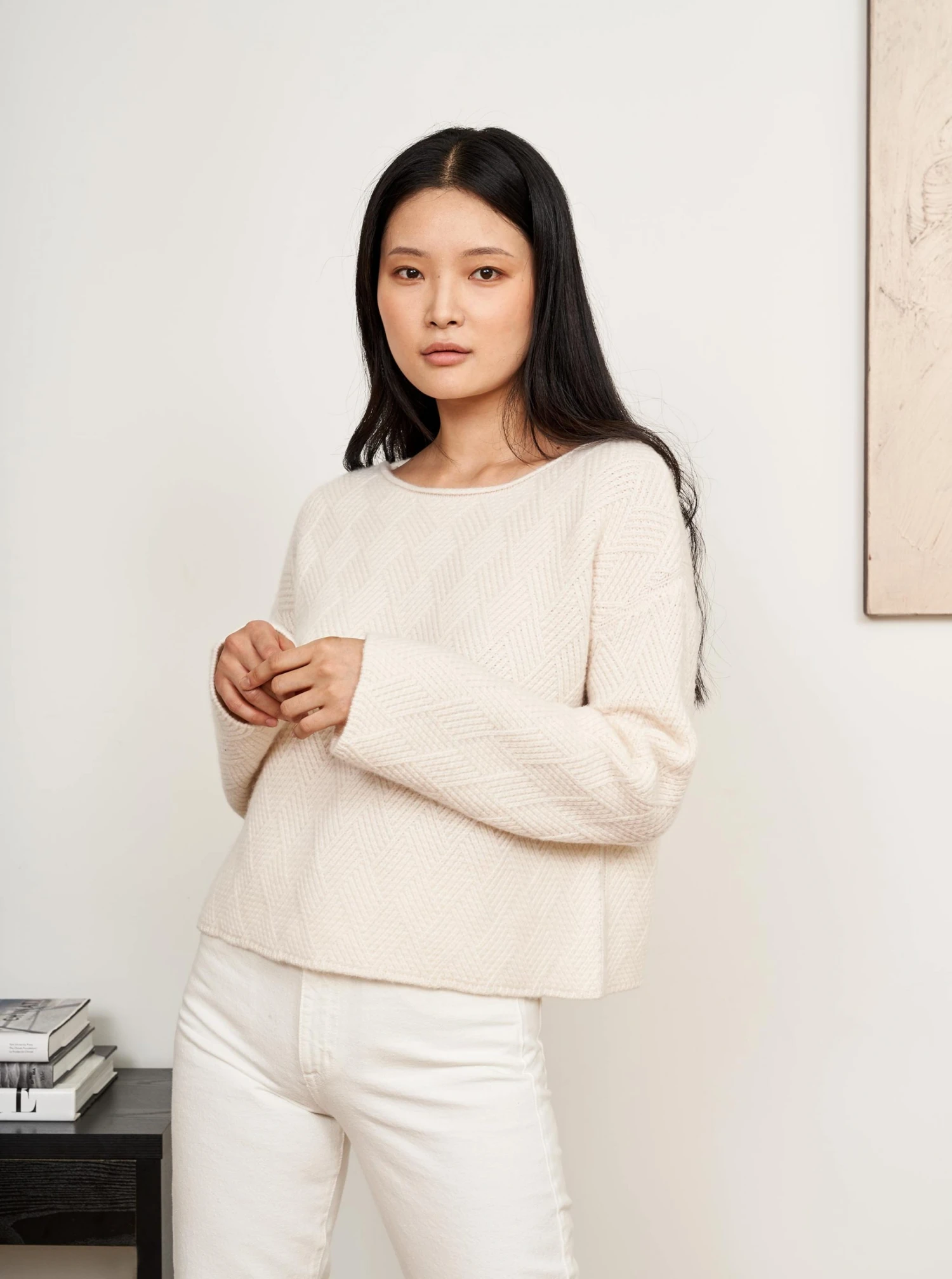 The loose and easy sweater of your rêves has arrived in a textured basket stitch knit in luxe, cream cashmere. With a dropped shoulder and boxy, cropped fit this knit is everything you’ve dreamed of.