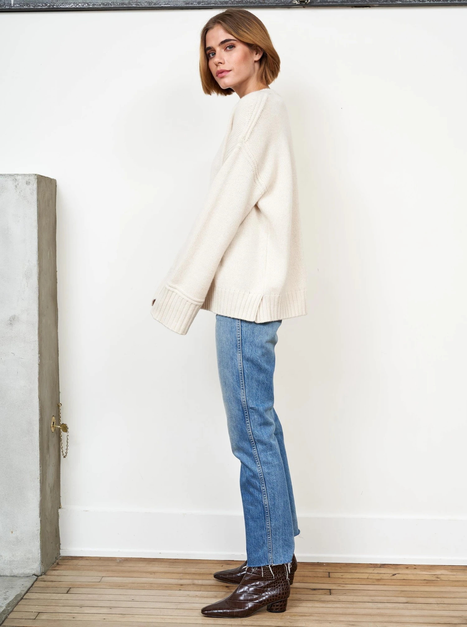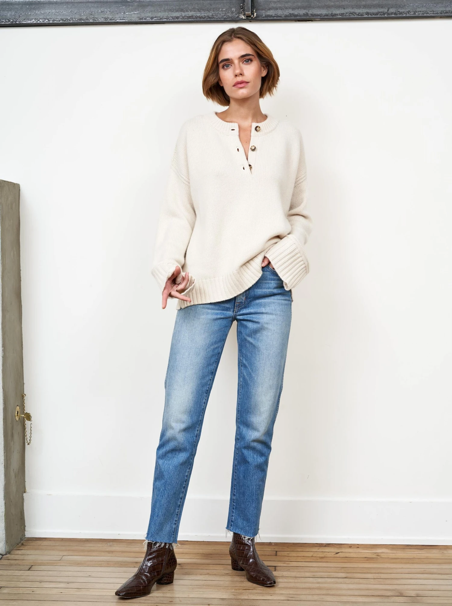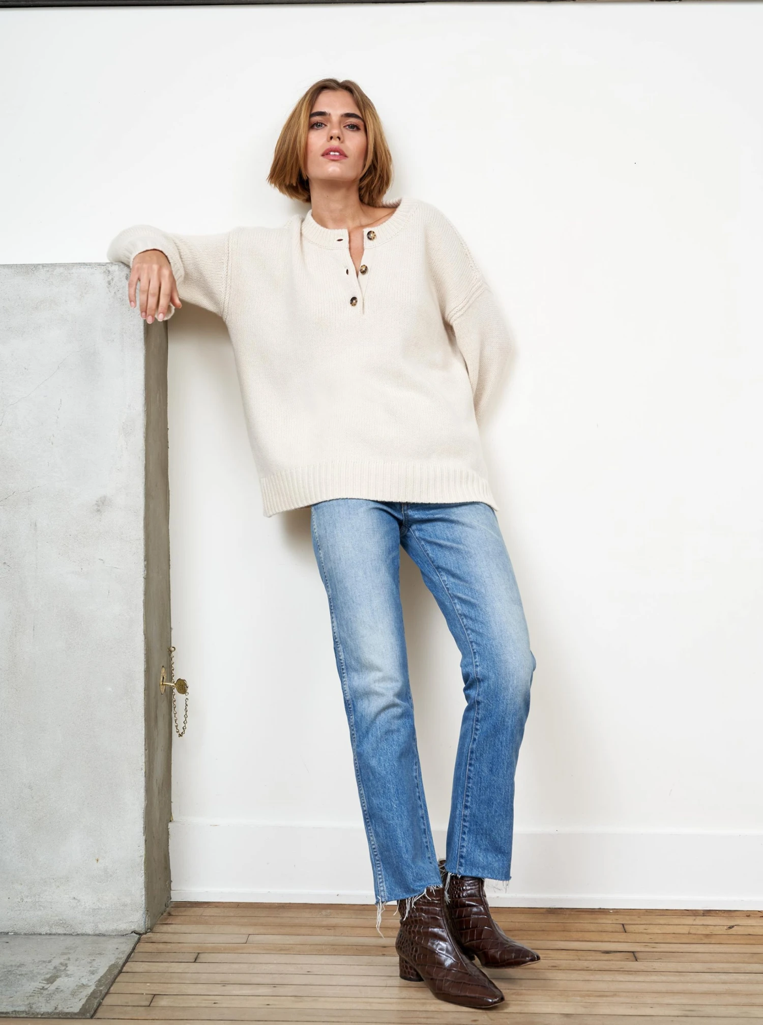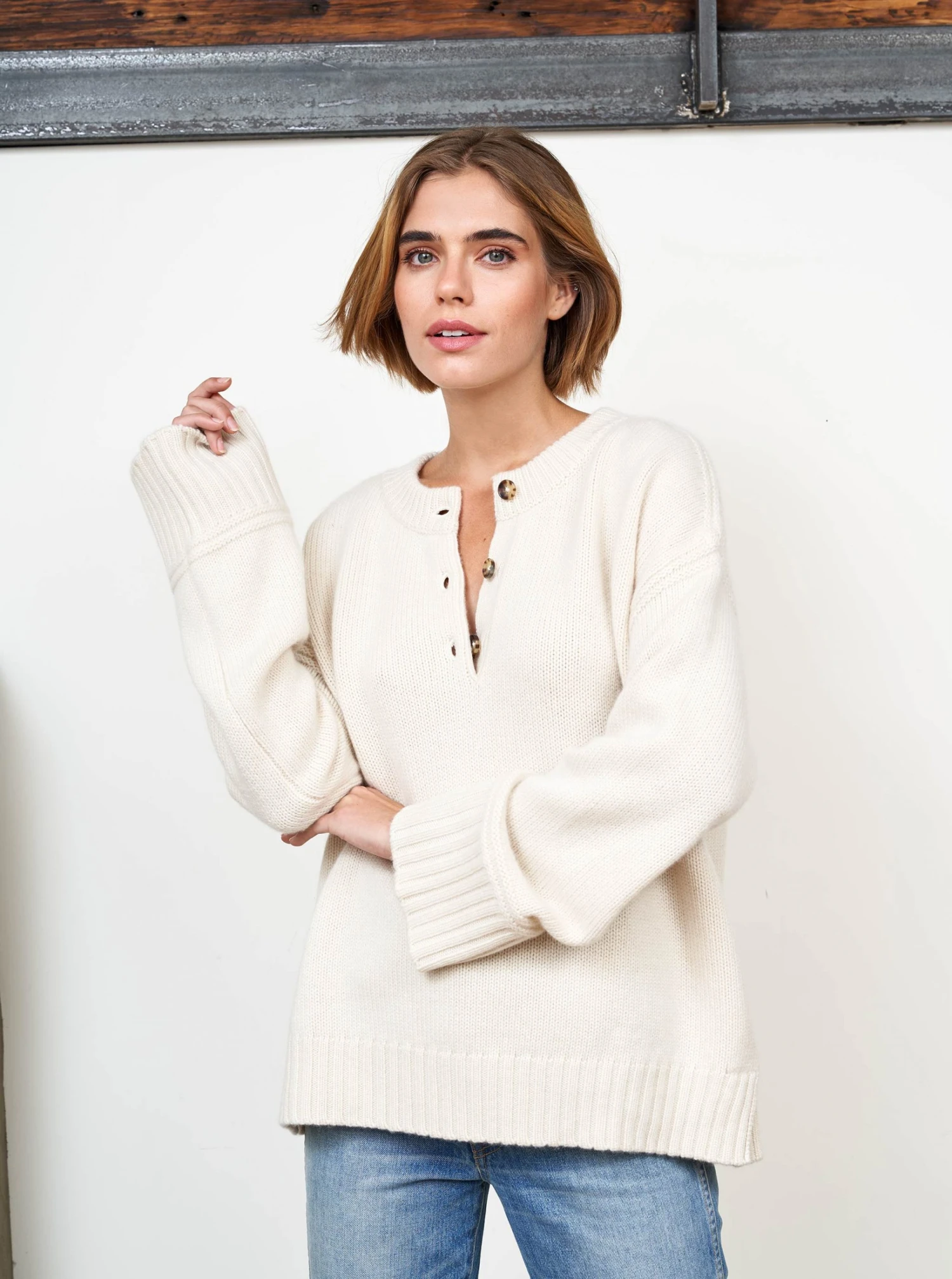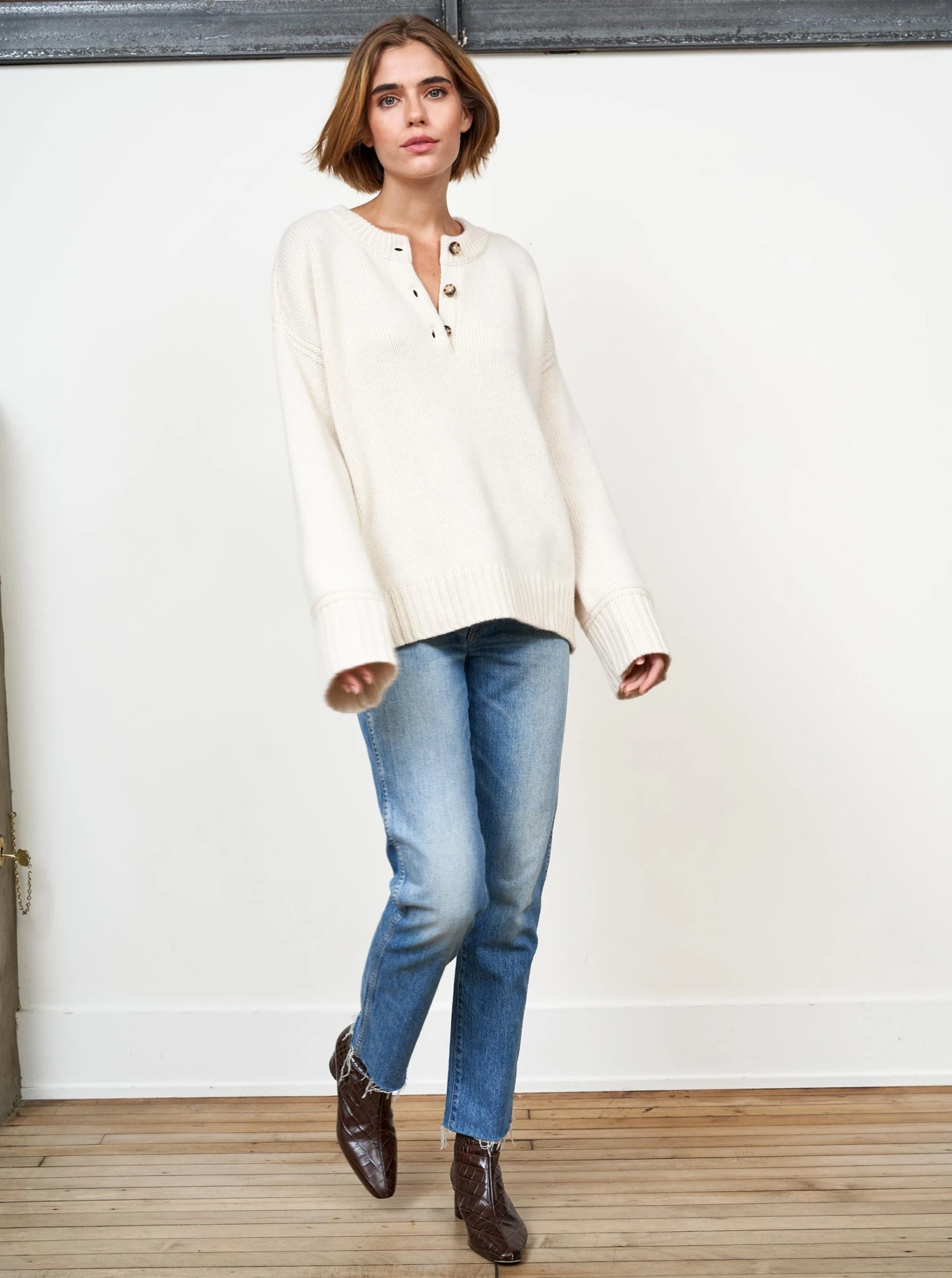 Our co-founder Valerie Macaulay’s favorite sweater, this oversized henley with function button placket is chic with winter white, excellent over your favorite denim and a no brainer with a classic wide leg trouser. This 100% cashmere sweater will be your go-to season after season.