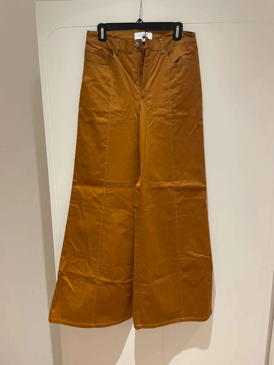 Get in line with our cotton twill wide leg pant in cognac with contrast stitching. The exaggerated flare is the kick your wardrobe wants.