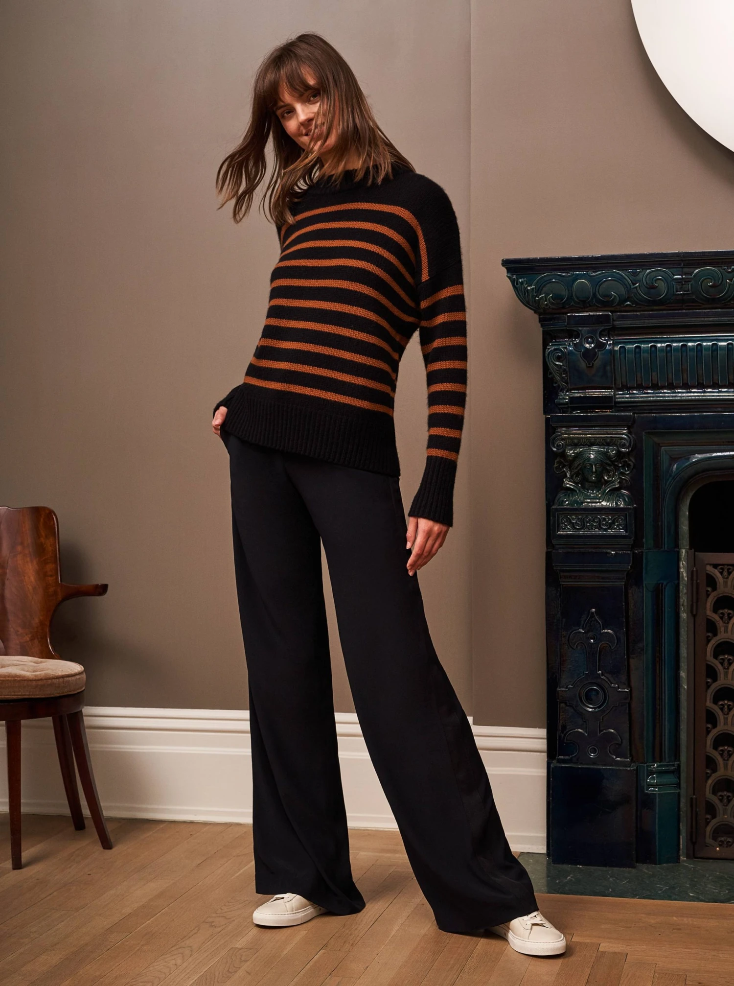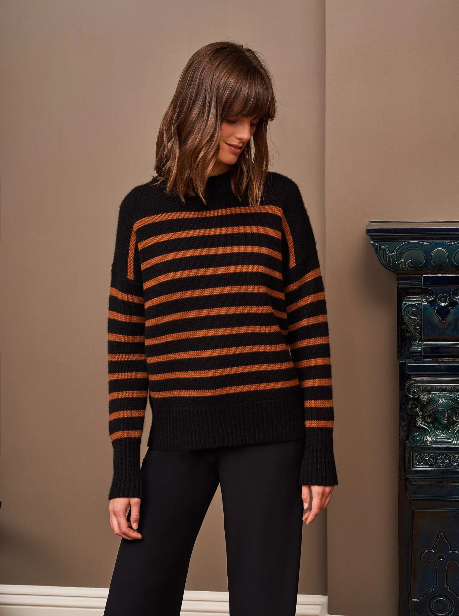 Get on board with our black and cognac stripe 7-ply wool-cashmere sweater. Comfort and style, not mutually exclusive.