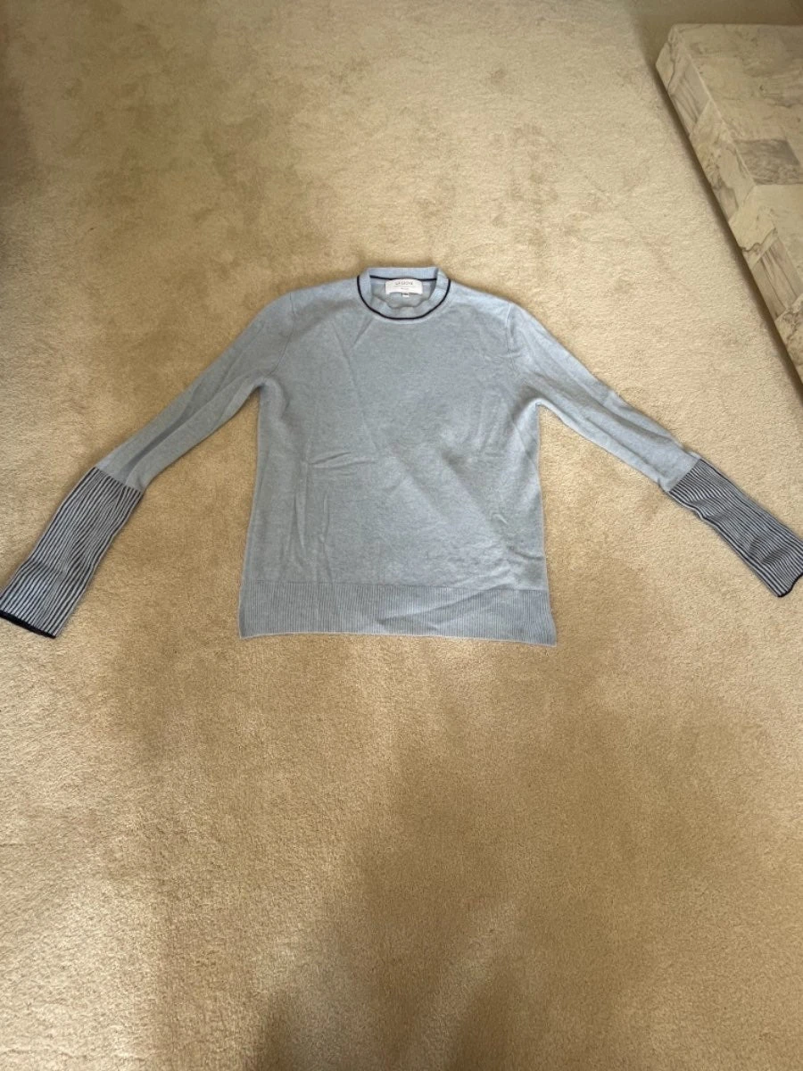 Anytime. Anywhere. Anyplace. You know that piece, the one you hope no one will notice you’ve worn three days in a row? This is that sweater in light blue cashmere with elongated sleeves. You can thank us later.