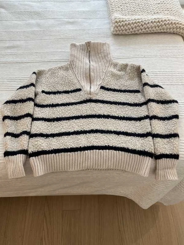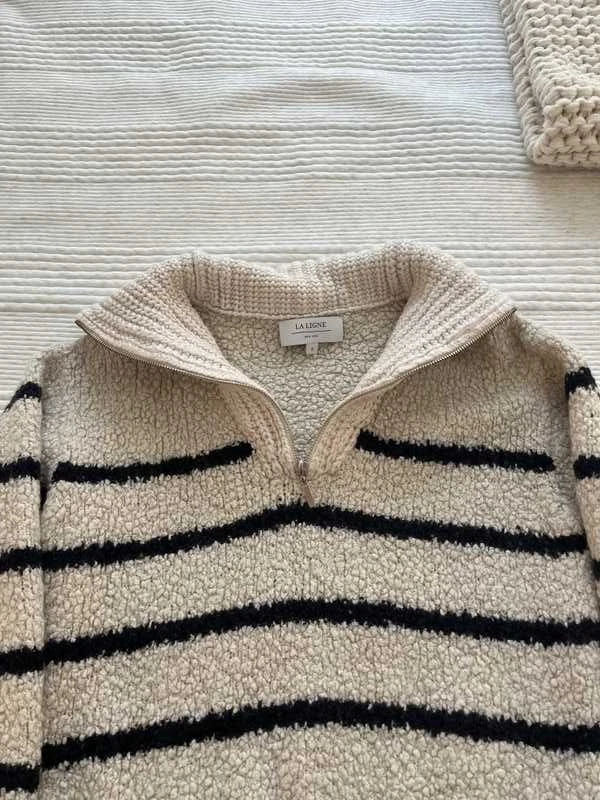 Our Sherpa Bastien Sweater is the newest closet staple where function meets fabulous in delicious striped bouclé wool fashioned in a borrowed-from-the-boys silhouette.